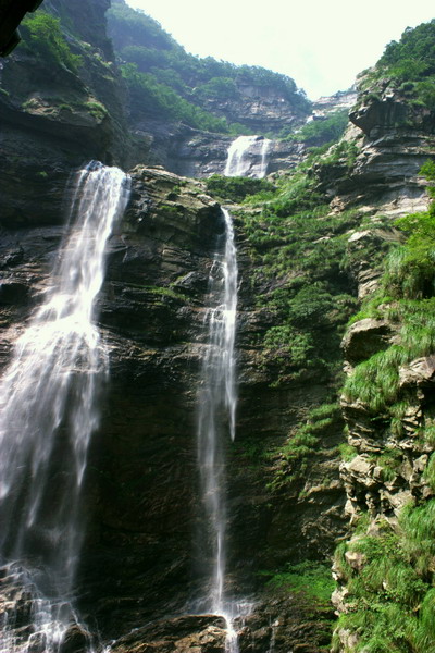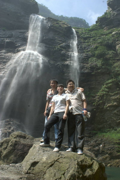 进入三叠泉景区内,踏着很陡的山路石阶,一步一步地朝下走,据统计,共有三千余级台阶,途中看到一些人坐着轿子上下,我们很是佩服轿夫们的体力。在不知不觉中下了一千多级台阶,脚似乎也越来越重了,真是上山容易下山难啊!好不容易才下到谷底,终于看到了传说中的三叠泉。仰望三叠泉:只见瀑布飞流直下,煞是壮观。涧水随着山崖奔泻而来,声势有如千军万马在冲锋陷阵;到达底部时已被三层岩石劈成一朵朵浪花迎面向我们扑来,包围我们。站在泉底,体会这来自大自然的魅力那种感觉真是令人心旷神怡而忘却自我。此情此景让我们想起了李白的诗:“飞流直下三千尺,疑是银河落九天”。我们大家不禁陶醉在其中,此时又和同事们选好了位置尽情的拍照,脚下水池的泉水真是清澈见底,凉爽舒适。