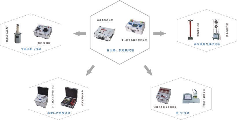 变压器试验、发电机试验类设备用于各种单相变压器、三相变压器、电压互感器的变比、接线组别、极性的测量,变压器绕组、电机绕组、电抗器绕组、消弧线圈及PT等感性设备直流电阻的快速测量,电力系统中电力变压器及特种变压器有载分接开关电气性能指标的综合测量的检测和分析,变压器的空载、负载、容量测试,水内冷发电机的绝缘电阻、吸收比和极化指数的测量以及各种同步发电机转子交流阻抗及其特性曲线的测量等。